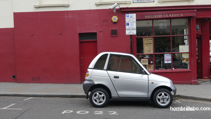 Una foto que habla de dos mundos. Tomada en el Portobello market de Londres, un coche enano frente a una tienda con nombre Italiano nos da la impresión de estar en Italia, con coches pequeños y compactos.