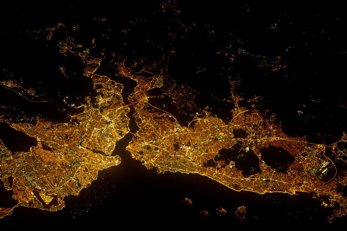 Estoy muy sensible a todo lo que sea Estambul estos días. Tengo muchas ganas de visitar la ciudad más famosa de capital de Turquía, la única gran ciudad del mundo apoyada en dos continentes a la vez. Y como veis en esta foto tomada desde la Estación Espacial Internacional, al menos desde el espacio, es preciosa.