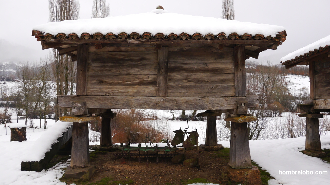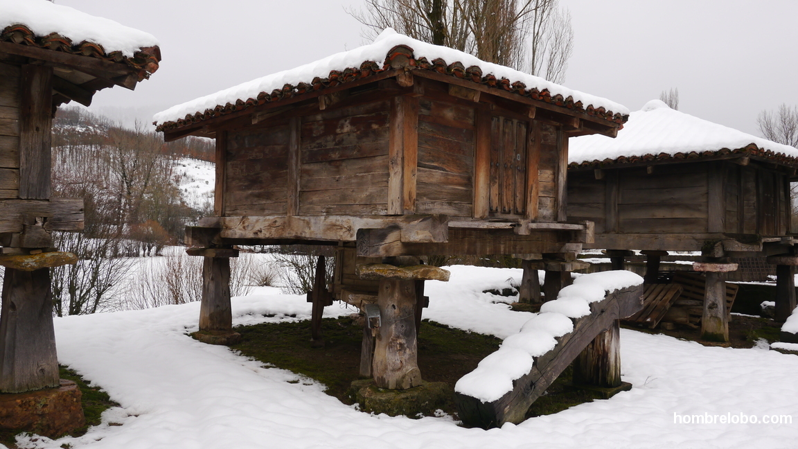 Hermosas fotos!. La nieve «magnifica» el paisaje. De acuerdo con Javier Domingo, aunque tal vez habría que puntualizar que en Asturias son mas comunes los tejados a 4 aguas y muy raros los de 2 aguas, estos últimos creo que son, los mas corrientes de León. Os dejo un enlace sobre Hórreos leoneses: http://raigame.blogspot.com.es/p/horreos-leoneses.html. Gracias por tus fotos Eduardo.